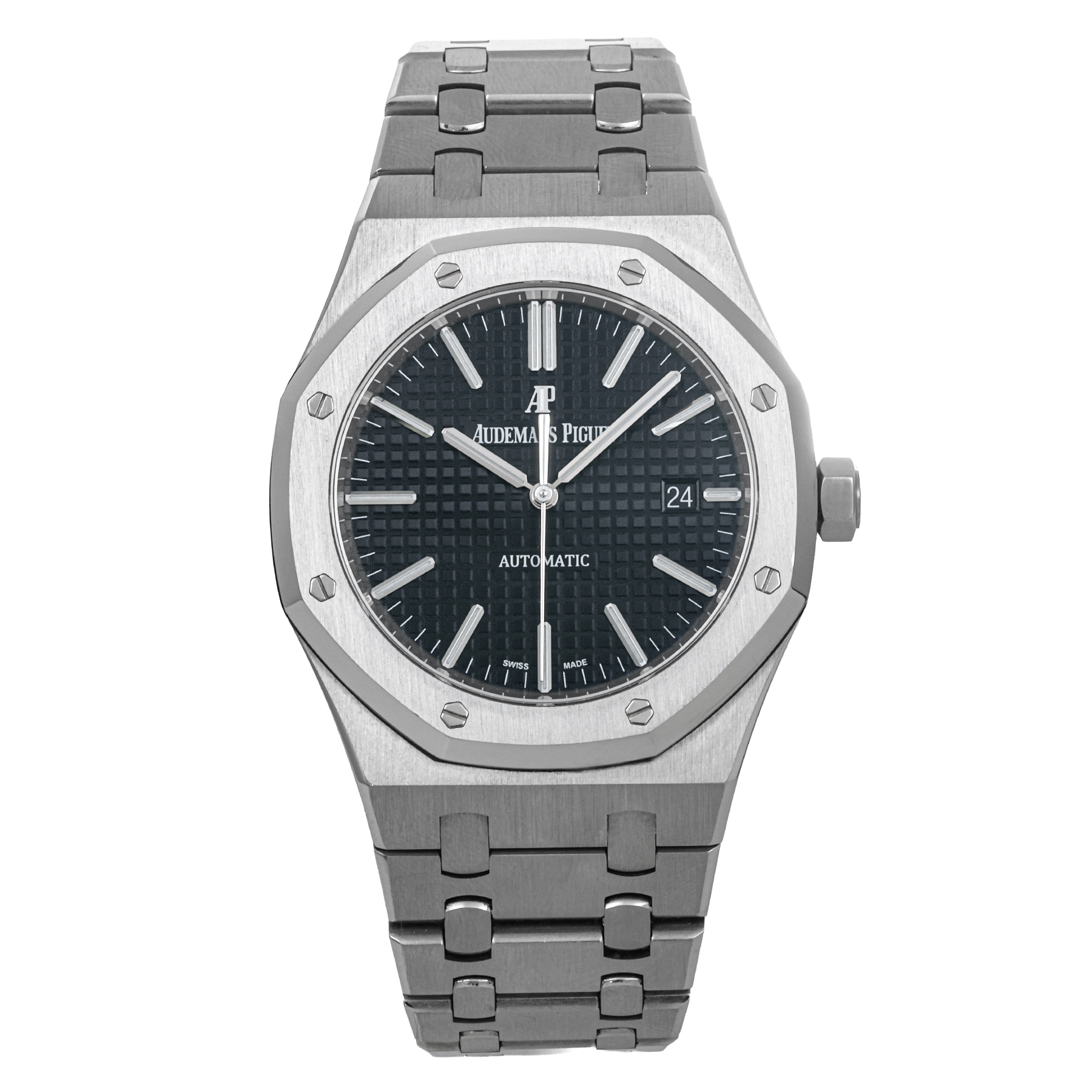 One of the most recognizable elements of the Royal Oak, the octagonal bezel is secured by eight exposed hexagonal screws, a hallmark of Gérald Genta’s original design. Finished with sharp polished edges and brushed surfaces, the bezel adds a bold architectural presence while reinforcing the watch’s sporty yet luxurious identity.
